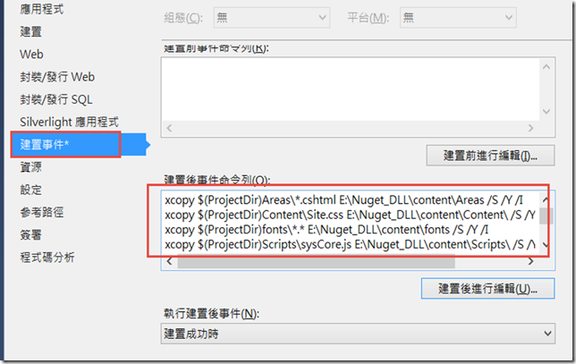 1.打開[專案屬性]的建置事件-->建置後事件命令列 輸入xcopy語法以下為我目前使用的語法if $(ConfigurationName) == Release (