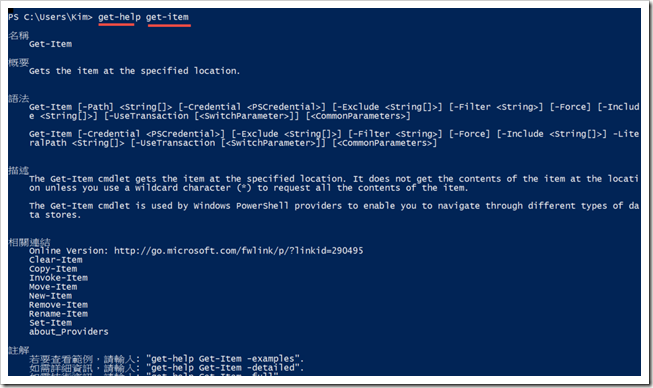第二個參數為查詢的指令,執行後會顯示此指令的說明3.get-command